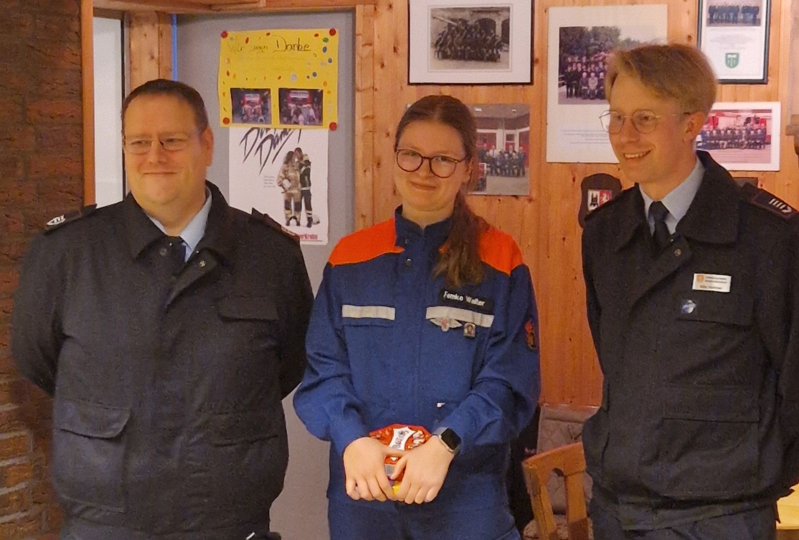 Erfreulich ist allerdings, dass es immer wieder Neuaufnahmen in die Jugendfeuerwehr gibt. Zwei Jugendliche wurden im laufenden Jahr neu aufgenommen. Ebenso erfreulich ist, dass die Einsatzabteilung mit Femke Walter nun Verstärkung bekommt. Mit Erreichen des 18. Lebensjahres scheidet Sie aus der Jugendfeuerwehr aus und wechselt.